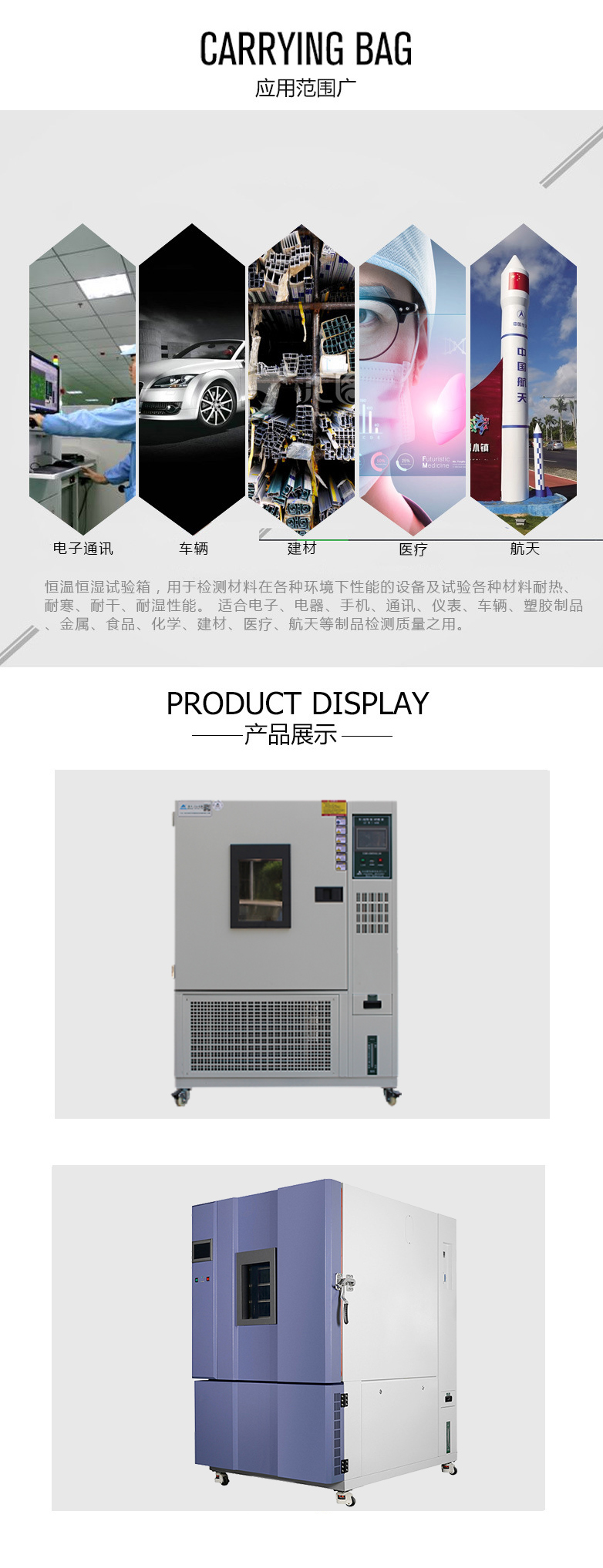 •對(duì)電工、電子、家用電器、汽車、摩托車、化工及其它產(chǎn)品零部件及材料進(jìn)行溫度、溫度試驗(yàn)