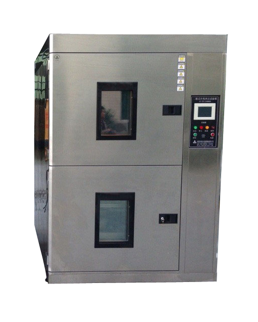 4、立式兩箱高低溫循環沖擊試驗箱:樣品放在蓄冷或蓄熱槽內,兩槽隔板瞬間打開,樣品移至另一槽內,兩槽溫度發生對流而變化至到達設定沖擊溫度所需要時間。